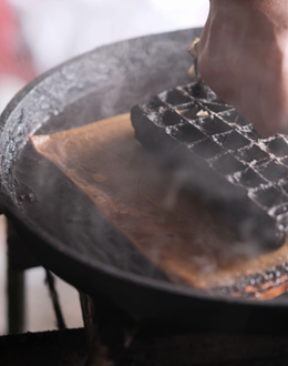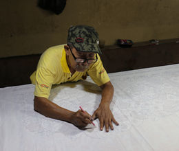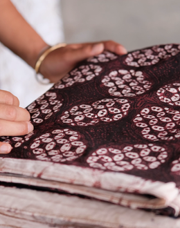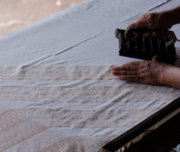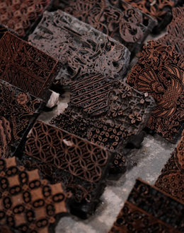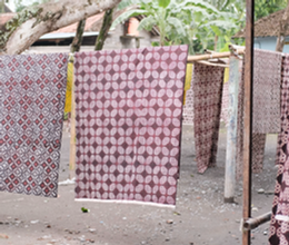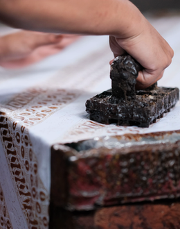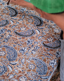 Batik Cap is a technique using a copper stamp to apply wax in repeated patterns. Again, after dyeing and drying, the wax is carefully removed and revealing its final design.